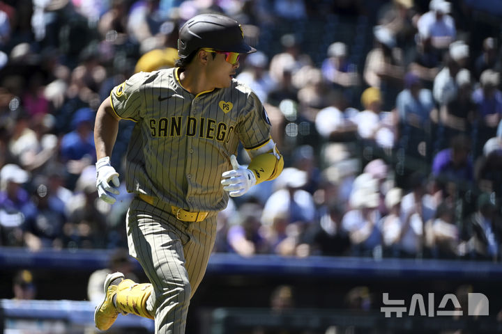 [덴버=AP/뉴시스] 샌디에이고 파드리스의 김하성이 18일(현지시각) 미 콜로라도주 덴버의 쿠어스 필드에서 열린 2024 메이저리그 콜로라도 로키스와 경기 3회 초 안타를 친 후 1루로 달리고 있다. 김하성은 이후 어깨 부상으로 교체됐고 샌디에이고는 2-3으로 패했다. 2024.08.19.