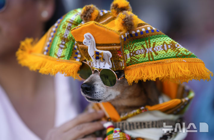 [라파스=AP/뉴시스] 18일(현지시각) 볼리비아 라파스에서 개들의 수호성인 '성 로코'(Saint Roch)의 날을 기념하는 도그 패션쇼가 열려 전통 리아메라다 복장의 견공이 경연하고 있다. 2024.08.19,