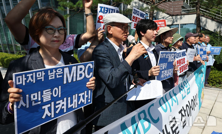 [서울=뉴시스] 김금보 기자 = 방송통신위원회가 새로 임명한 방송문화진흥회(MBC대주주) 이사 6명에 대한 임명 효력 집행정지 소송 심문 기일인 19일 오전 서울 서초구 서울행정법원 앞에서 자유언론실천재단, 서울의 소리, 언론소비자 주권행동, 한국민예총, 민생연구소, 전국대학민주동문회협의회, 5.18 서울기념사업회 등 'MBC 지키자! 시민모임' 회원들이 방송문화진흥회 이사 선임 부당성을 말하는 기자회견을 하고 있다. 2024.08.19. [email protected]