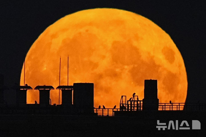 [모스크바=AP/뉴시스] 19일(현지시각) 러시아 모스크바의 주거용 건물들 뒤로 슈퍼문이 떠 오르고 있다. 슈퍼문은 달이 궤도에서 지구에 가장 가까이 근접할 때(90% 이내) 발생하며 일반 보름달보다 7% 더 크고 약 16% 더 밝게 보인다. 2024.08.20.