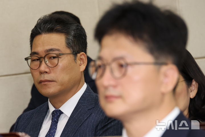 서울=뉴시스] 조성우 기자 = 백해룡(왼쪽) 강서경찰서 화곡지구대장이 20일 서울 여의도 국회에서 열린 행정안전위원회의 마약수사 외압 의혹 관련 청문회에서 김찬수 대통령실 행정관(전 영등포경찰서장)을 응시하고 있다. 2024.08.20. [email protected]