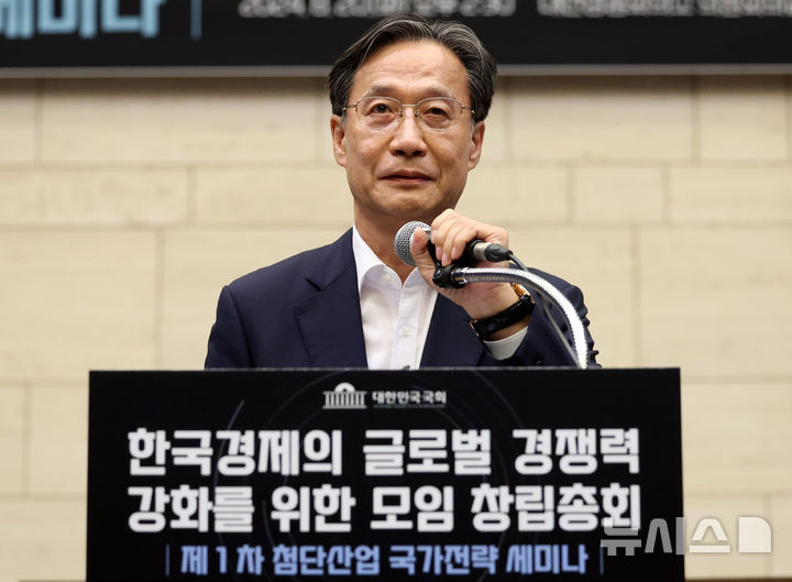 [서울=뉴시스] 이영환 기자 = 20일 오후 서울 중구 대한상공회의소에서 열린 한국경제의 글로벌 경쟁력 강화를 위한 모임 창립총회에서 유동수 공동대표가 인사말을 하고 있다. 2024.08.20. [email protected]