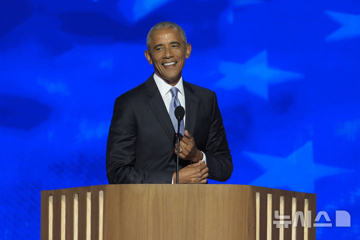 [시카고=AP/뉴시스] 버락 오바마 전 미국 대통령이 20일(현지시각) 일리노이주 시카고의 유나이티드 센터에서 열린 민주당 전당대회(DNC) 2일 차 연단에 올라 해리스 부통령 지지 연설을 하고 있다. 2024.08.21.