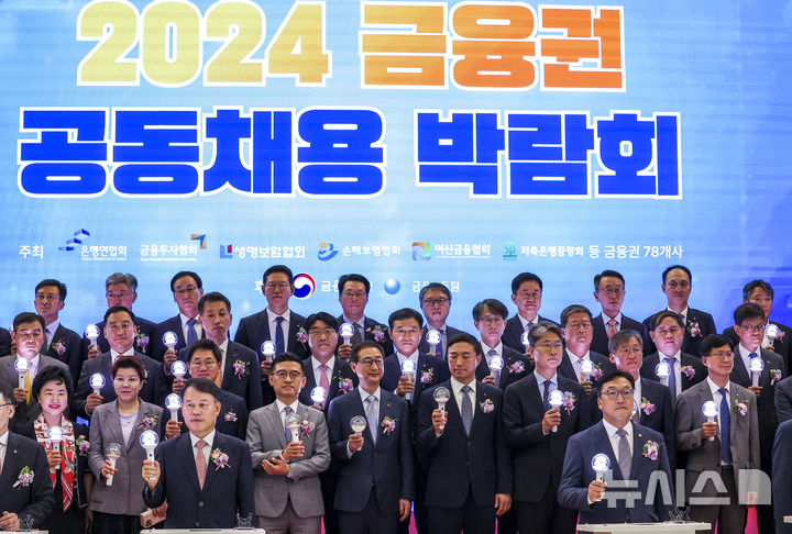 [서울=뉴시스] 정병혁 기자 = 김병환 금융위원장을 비롯한 참석자들이 21일 서울 중구 동대문디자인플라자에서 열린 2024 금융권 공동채용 박람회에서 기념촬영을 하고 있다. 2024.08.21. [email protected]
