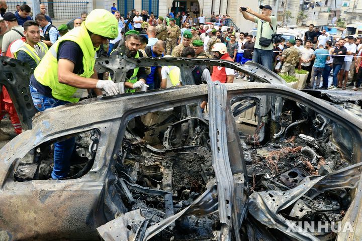 [시돈=신화/뉴시스] 21일(현지시각) 레바논 남부 시돈에서 사람들이 이스라엘의 무인기가 발사한 미사일에 파괴된 차량 잔해를 살피고 있다. 레바논군 당국은 이날 오전 이스라엘 드론이 SUV 차량에 미사일 2발을 발사해 팔레스타인 파타당 간부 칼릴 알-마크다가 숨졌다고 전했다. 2024.08.22.
