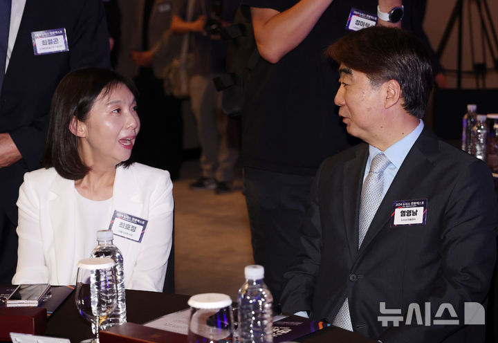 [서울=뉴시스] 이영환 기자 = 염영남 뉴시스 대표이사와 최호정 서울시의회 의장이 22일 오후 서울 강남구 조선팰리스강남 그레이트홀에서 열린 제6회 뉴시스 한류엑스포(2024 뉴시스 한류엑스포)에서 대화를 나누고 있다. 2024.08.22. [email protected]