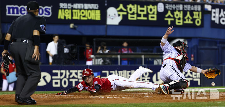 [서울=뉴시스] 김근수 기자 = 22일 오후 서울 송파구 잠실야구장에서 열린 2024 KBO리그 SSG 랜더스와 LG 트윈스의 경기, 3회초 1사 주자 1,3루 상황에서 3루 주자 최상민이 홈으로 슬라이딩해 득점에 성공하고 있다. 2024.08.22. [email protected]