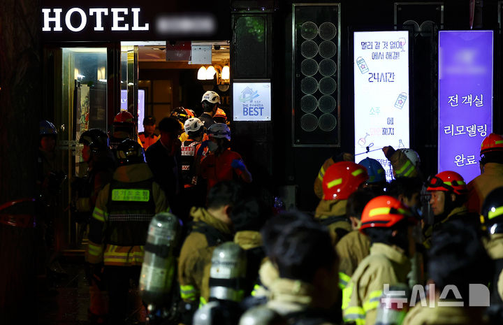 [부천=뉴시스] 김근수 기자 = 22일 오후 경기 부천시 원미구의 숙박업소에서 화재가 발생한 가운데 소방대원들이 분주히 이동하고 있다. 2024.08.22. [email protected]