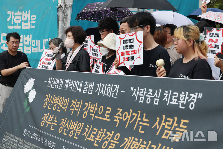 [서울=뉴시스] 고승민 기자 = 정신병원개혁연대 회원들이 23일 서울 여의도 국회 앞에서 정신병원 개혁연대 출범 기자회견을 하고 있다. 2024.08.23. [email protected]
