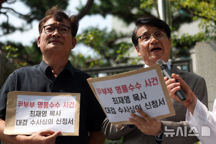 [서울=뉴시스] 김명년 기자 = 최재영 목사가 23일 오전 서울 서초구 대검찰청 앞에서 '윤 대통령 부부에 대한 대검찰청수사심의위원회 소집 신청서' 제출에 앞서 기자회견을 하고 있다. 2024.08.23. [email protected]