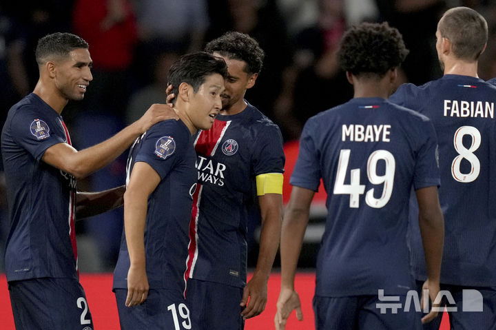 [파리=AP/뉴시스] 파리 생제르맹(PSG)의 이강인(왼쪽 두 번째)이 23일(현지시각) 프랑스 파리의 파르크 데 프랭스에서 열린 2024-25시즌 리그1 2라운드 몽펠리아와의 경기 후반 37분 팀의 6번째 골을 넣은 후 동료들의 축하를 받고 있다. 이강인은 교체 투입 20분 만에 골을 기록했고 PSG는 6-0으로 대승했다. 2024.08.24.