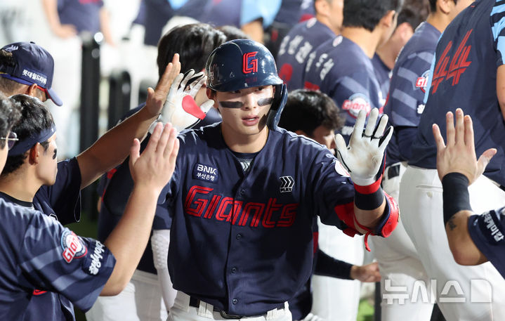 [대구=뉴시스] 이무열 기자 = 25일 오후 대구 수성구 삼성라이온즈파크에서 열린 2024 신한 SOL 뱅크 KBO리그 롯데 자이언츠와 삼성 라이온즈의 경기, 5회초 1사 주자 없는 상황에서 롯데 윤동희가 솔로 홈런을 때린 뒤 더그아웃에 들어서며 동료들과 기뻐하고 있다. 2024.08.25. [email protected]
