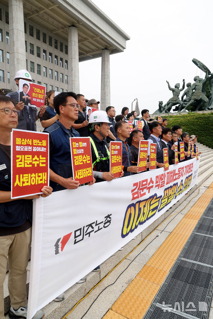 [서울=뉴시스] 조성봉 기자 = 박해철 더불어민주당 의원이 26일 오전 서울 여의도 국회 본청 계단에서 열린 '김문수 막말 피해 노동자 기자회견’에서 발언을 하고 있다. 2024.08.26. [email protected]