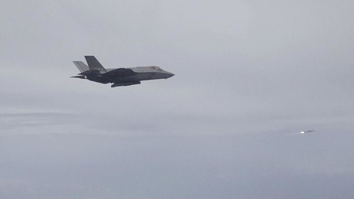[서울=뉴시스]공군 F-35A 전투기가 26일 서해상에서 순항미사일·무인공격기 역할을 하는 훈련용 표적을 향해 AIM-120C 공대공 미사일을 발사하고 있다.
