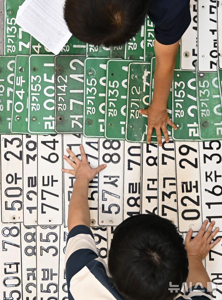 [의왕=뉴시스] 김종택 기자 = 체납차량 일제단속의 날인 27일 경기도 의왕시청에서 징수과 지방세체납팀 직원들이 체납차량에서 영치한 자동차 번호판을 정리하고 있다.