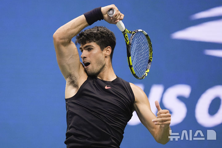 [뉴욕=AP/뉴시스] 카를로스 알카라스(3위·스페인)가 27일(현지시각) 미국 뉴욕의 빌리진킹 내셔널 센터에서 열린 2024 US오픈 테니스 남자 단식 1회전에서 리 투(186위·호주)와 경기하고 있다. 알카라스가 3-1(6-2 4-6 6-3 6-1)로 이기고 2회전에 올랐다. 2024.08.28.