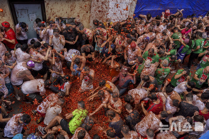 [부뇰=AP/뉴시스] 28일(현지시각) 스페인 발렌시아 인근 부뇰 마을에서 연례 토마토 축제 '라 토마티나'가 열려 참가자들이 서로에게 토마토를 던지고 있다. 해마다 8월 마지막 수요일에 열리는 이 축제는 1940년대, 마을 광장에서 토마토를 던지며 싸움을 한 데서 유래한 것으로 알려져 있으며 지금은 일정량의 토마토를 거리에 쏟아 놓고 마을 주민과 관광객들이 토마토를 서로에게 던지며 즐기는 축제로 발전했다. 2024.08.28.