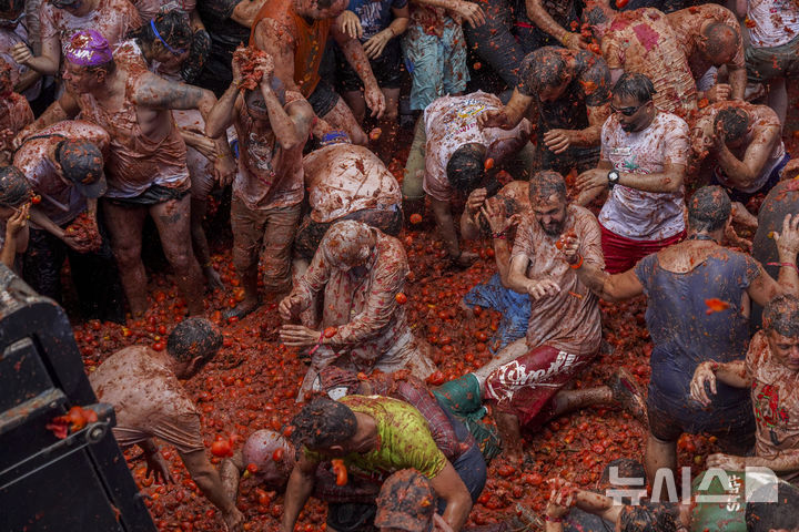 [부뇰=AP/뉴시스] 28일(현지시각) 스페인 발렌시아 인근 부뇰 마을에서 연례 토마토 축제 '라 토마티나'가 열려 참가자들이 서로에게 토마토를 던지고 있다. 해마다 8월 마지막 수요일에 열리는 이 축제는 1940년대, 마을 광장에서 토마토를 던지며 싸움을 한 데서 유래한 것으로 알려져 있으며 지금은 일정량의 토마토를 거리에 쏟아 놓고 마을 주민과 관광객들이 토마토를 서로에게 던지며 즐기는 축제로 발전했다. 2024.08.28.