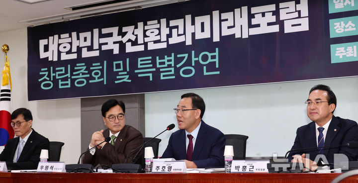 [서울=뉴시스] 조성우 기자 = 28일 오전 서울 여의도 국회 의원회관에서 열린 의원연구단체 대한민국 전환과 미래 포럼 창립총회에서 포럼 공동대표인 주호영 국민의힘 의원이 개회사를 하고 있다. 왼쪽부터 이창용 한국은행 총재, 우원식 국회의장, 주 의원, 박홍근 더불어민주당 의원. 2024.08.28. [email protected]