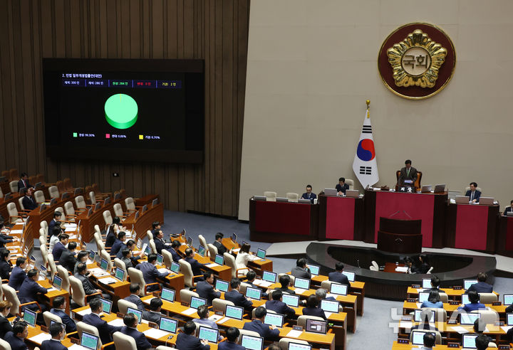 [서울=뉴시스] 고승민 기자 = 28일 서울 여의도 국회에서 열린 제417회 국회(임시회) 제2차 본회의에서 민법 일부개정법률안(구하라법)이 재석 286인, 찬성 284인, 기권 2인으로 가결되고 있다. 2024.08.28. [email protected]