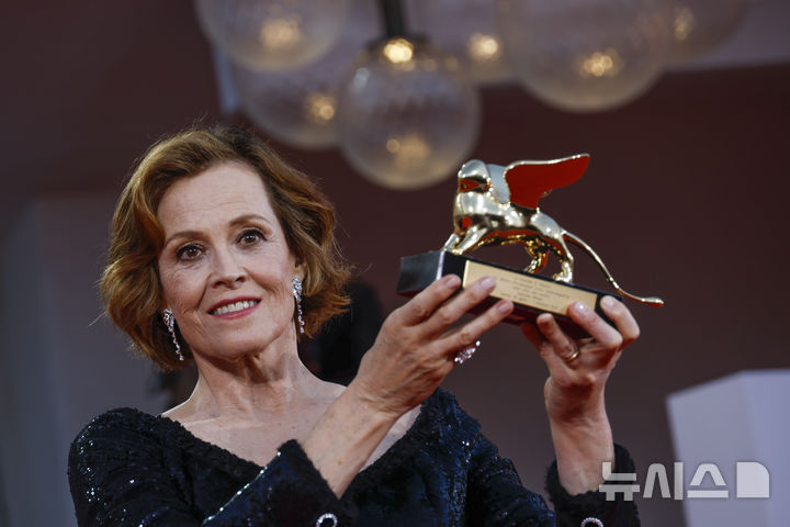 [베네치아=AP/뉴시스] 배우 시고니 위버가 28일(현지시각) 이탈리아 베네치아에서 개막한 제81회 베네치아국제영화제 개막식 무대에서 '평생 공로' 황금사자상을 받은 후 사자상을 들고 포즈를 취하고 있다. 2024.08.28.