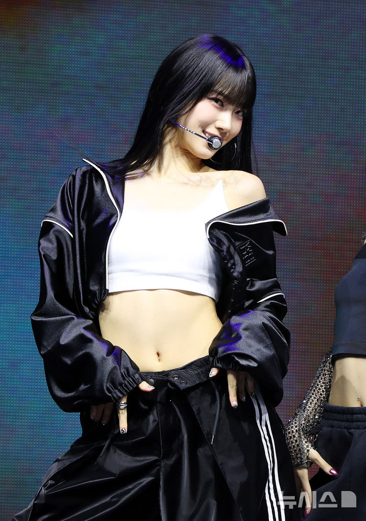 [서울=뉴시스] 김혜진 기자 = 그룹 르세라핌 카즈하가 29일 오후 서울 광진구 예스24라이브홀에서 열린 네 번째 미니앨범 '크레이지(CRAZY)' 발매 기념 쇼케이스에서 무대를 선보이고 있다.