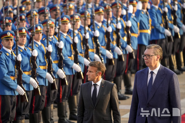 [베오그라드=AP/뉴시스] 에마뉘엘 마크롱(왼쪽) 프랑스 대통령이 29일(현지시각) 세르비아 베오그라드에서 알렉산다르 부치치 세르비아 대통령과 함께 세르비아 의장대를 사열하고 있다. 이틀 일정으로 세르비아를 국빈 방문한 마크롱 대통령은 부치치 대통령과 핵에너지, 프랑스제 라팔 전투기 공급 등에 합의한 것으로 알려졌다. 2024.08.30.
