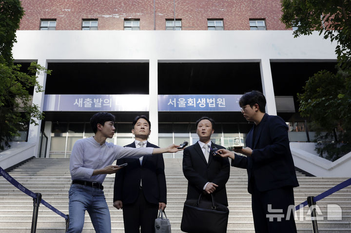 [서울=뉴시스] 최동준 기자 = 류화현 위메프 대표, 류광진 티몬 대표가 30일 서울 서초구 서울회생법원에서 열린 회생절차 협의회를 마치고 입장을 밝히고 있다. 2024.08.30. [email protected]