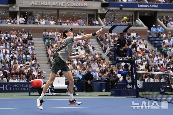 [뉴욕=AP/뉴시스] 얀니크 신네르(1위·이탈리아)가 지난달 31일(현지시각) 미국 뉴욕의 빌리진킹 내셔널 센터에서 열린 2024 US오픈 테니스 남자 단식 3회전에서 크리스토퍼 오코넬(87위·호주)과 경기하고 있다. 신네르가 3-0(6-1 6-4 6-2)으로 완승하고 16강에 올랐다. 2024.09.01.