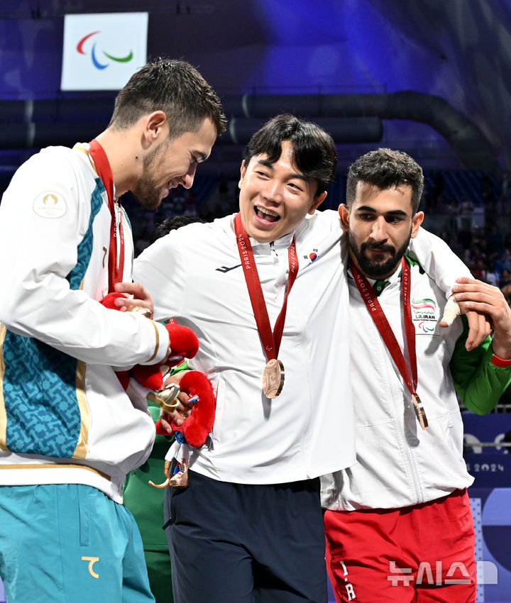 [파리=뉴시스] 사진공동취재단 = 동메달을 획득한 주정훈이 31일(현지시간) 프랑스 파리 그랑팔레에서 열린 2024 파리 패럴림픽 태권도 K44 남자 88kg급 시상식을 마친 후 다른 메달리스트들 부축을 받으며 퇴장하고 있다. 2024.09.01. [email protected]