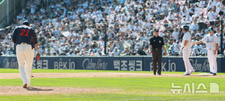 [서울=뉴시스] 고범준 기자 = 1일 서울 송파구 잠실야구장에서 열린 2024 KBO리그 롯데 자이언츠와 두산 베어스의 경기, 4회말 2사 2루 롯데 투수 박세웅이 두산 양의지에게 몸에 맞는 공을 던져 미안함을 표현하고 있다. 2024.09.01. [email protected]