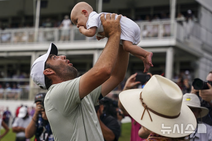 [애틀랜타=AP/뉴시스] 스코티 셰플러(미국)가 1일(현지시각) 미 조지아주 애틀랜타의 이스트레이크 골프클럽에서 열린 미국프로골프(PGA) 투어 페덱스컵 플레이오프 최종전 투어 챔피언십 정상에 오른 후 아들을 들어 올리고 있다. 셰플러는 최종 합계 30언더파 264타로 우승하며 상금 2500만 달러(약 335억 원)의 주인공이 됐다. 2024.09.02.