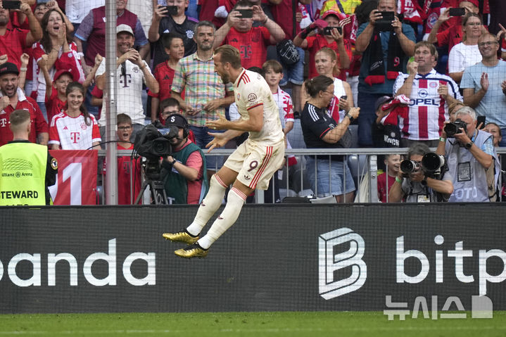 [뮌헨=AP/뉴시스] 바이에른 뮌헨의 해리 케인이 1일(현지시각) 독일 뮌헨 알리안츠 아레나에서 열린 2024-25시즌 분데스리가 2라운드 프라이부르크와 경기 전반 38분 페널티킥으로 선제골을 넣은 후 세리머니하고 있다. 케인은 시즌 첫 골을 기록하며 팀의 2-0 승리를 이끌었다. 2024.09.02.