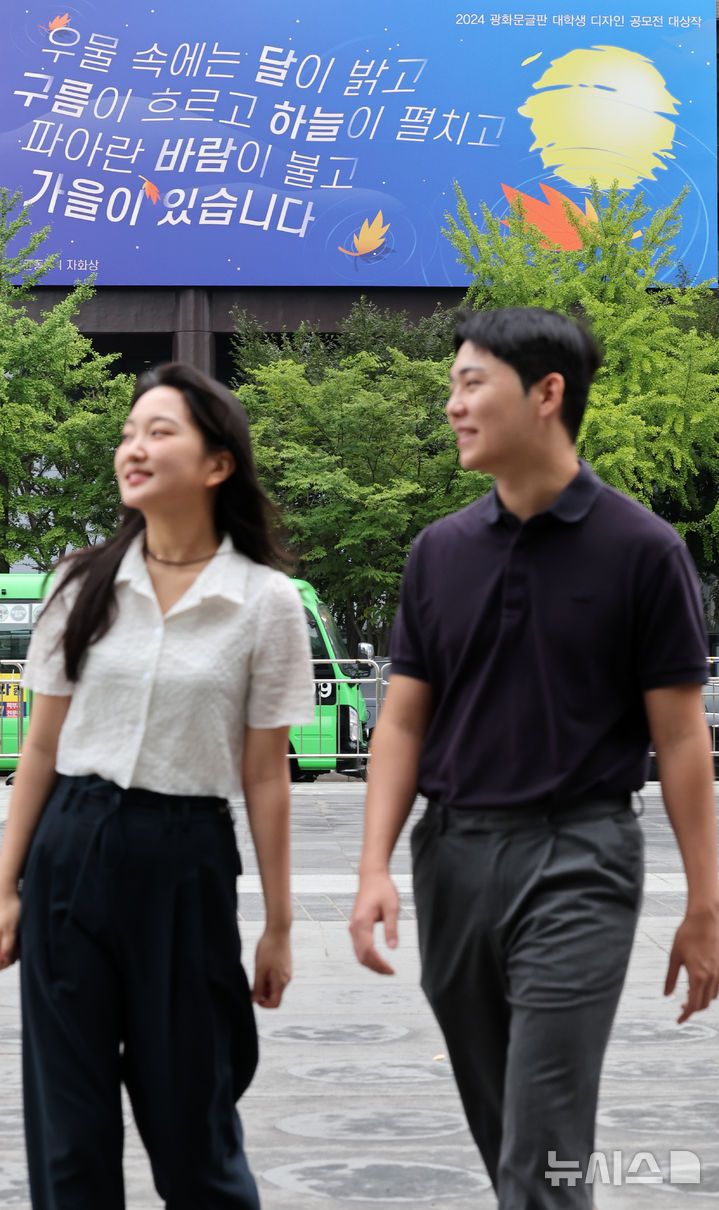 [서울=뉴시스] 배훈식 기자 = 2일 오전 서울 종로구 교보빌딩 외벽 광화문글판에 윤동주 시인의 시 '자화상'의 구절이 적혀있다. 이번 문구는 2024 광화문글판 대학생 디자인 공모전 대상작인 홍산하(추계예술대학교·21) 씨의 작품이다. 2024.09.02. [email protected]