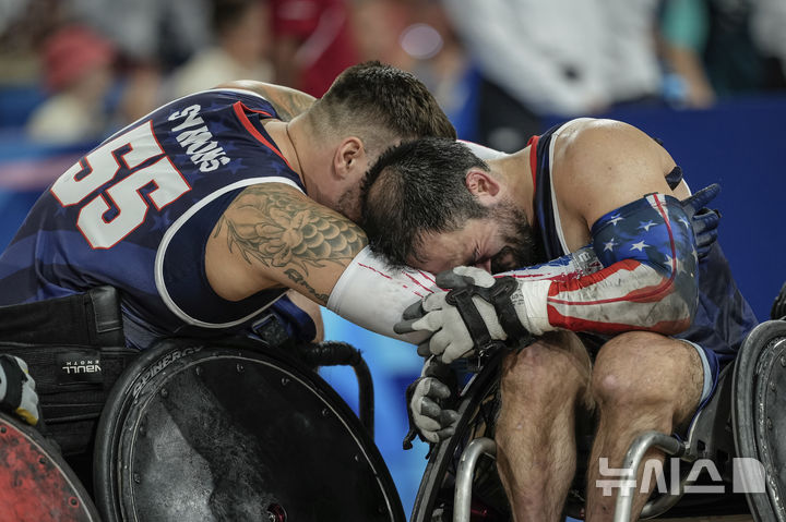[파리=AP/뉴시스] 2일(현지시각) 프랑스 파리에서 열린 2024 파리 패럴림픽 휠체어 럭비 결승전에서 일본에 패한 미국 선수들이 서로를 안고 위로하고 있다. 미국은 일본에 41-48로 패해 은메달을 목에 걸었다. 2024.09.03.