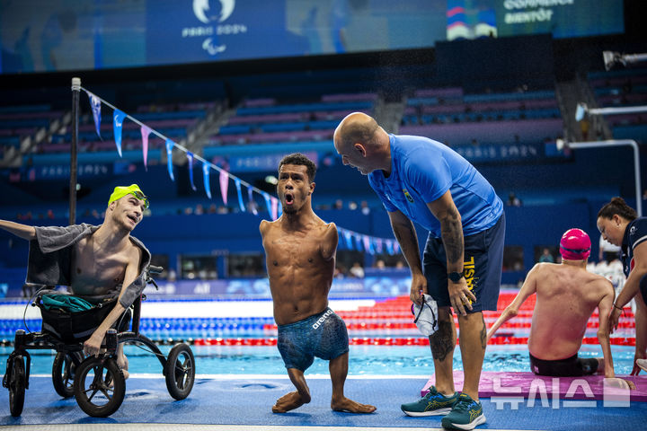 [파리=AP/뉴시스] 산투스 아라우주(브라질, 가운데)가 2일(현지시각) 프랑스 파리에서 열린 2024 파리 패럴림픽 수영 S2급 자유형 200m에서 우승한 후 한호하고 있다. 2024.09.03.