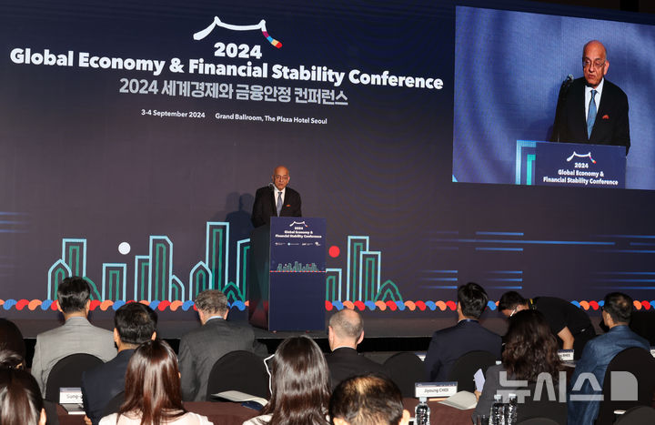 [서울=뉴시스] 배훈식 기자 = 마수드 아메드 글로벌개발센터(CGD) 원장이 3일 오후 서울 중구 플라자호텔 서울에서 열린 2024 세계경제와 금융안정 컨퍼런스에서 기조연설을 하고 있다. 2024.09.03. [email protected]