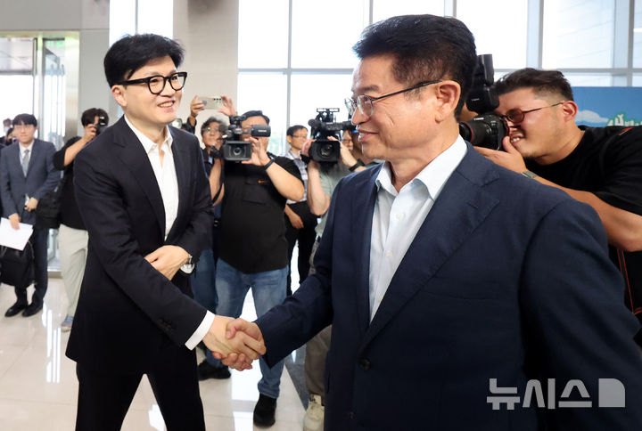 [구미=뉴시스] 이무열 기자 = 한동훈 국민의힘 대표와 이철우 경북도지사가 3일 오후 경북 구미시 새마을테마공원을 찾아 악수하고 있다. 2024.09.03. [email protected]