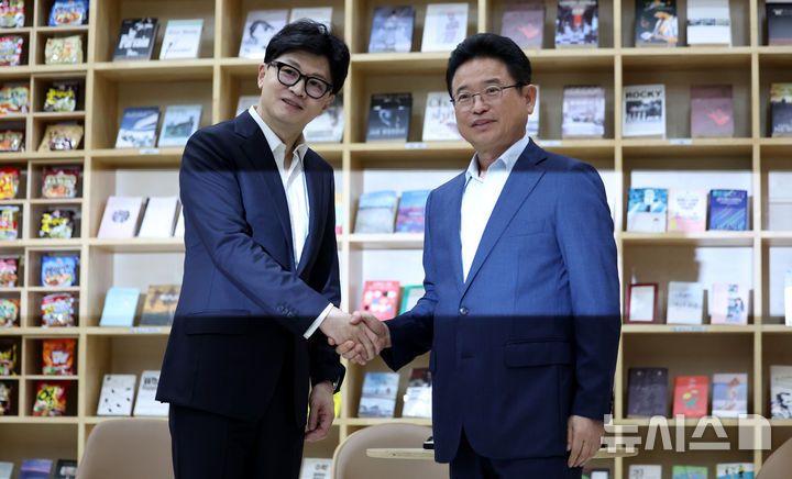 [구미=뉴시스] 이무열 기자 = 한동훈 국민의힘 대표가 3일 오후 경북 구미시 새마을테마공원을 찾아 이철우 경북도지사와 기념촬영을 하고 있다. 2024.09.03. [email protected]