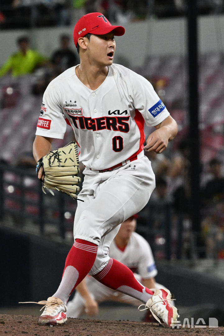 [광주=뉴시스] 이영주 기자 = 3일 오후 광주 북구 광주-기아챔피언스필드에서 열린 2024 신한 SOL뱅크 KBO리그 KIA 타이거즈 대 LG 트윈스의 경기, 8회 초 KIA 곽도규가 마운드에 올라 역투하고 있다. 2024.09.03. [email protected]