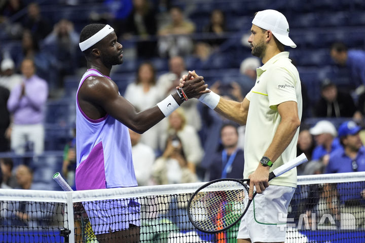 [뉴욕=AP/뉴시스] 프랜시스 티아포(20위·미국, 왼쪽)가 3일(현지시각) 미국 뉴욕의 빌리진킹 내셔널 센터에서 열린 2024 US오픈 테니스 남자 단식 8강전에서 그리고르 디미트로프(9위·불가리아)에 기권승을 거둔 후 인사를 나누고 있다. 티아포가 디미트로프의 부상으로 3-1(6-3 6-7 6-3 4-1) 기권승을 거두고 4강에 올라 테일러 프리츠(12위·미국)와 결승 진출을 다툰다. 2024.09.04.