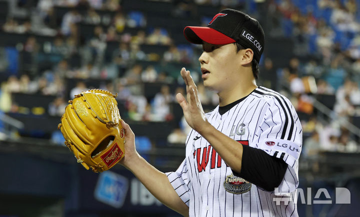 [서울=뉴시스] 홍효식 기자 = 4일 서울 송파구 잠실야구장에서 열린 2024 KBO리그 SSG 랜더스와 LG 트윈스의 경기, 7회초까지 무실점으로 수비를 마친 LG 선발 임찬규가 더그아웃으로 향하고 있다. 2024.09.04. [email protected]