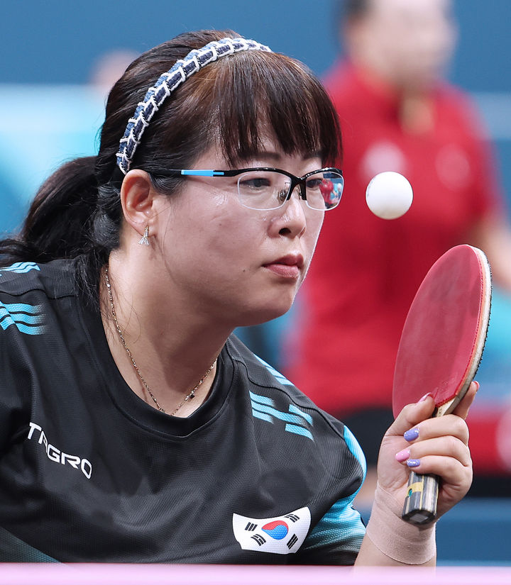 [서울=뉴시스] 김진아 기자 = 정영아가 4일(한국시간) 프랑스 파리 사우스 파리 아레나4에서 열린 2024 파리 패럴림픽 탁구 여자단식 준결승 중국 판자민을 상대로 경기를 하고 있다. 정영아는 판자민에게 세트 스코어 1-3(11-9 6-11 8-11 10-12)로 패해 동메달을 확정했다. (사진=대한장애인체육회 제공) 2024.09.04. [email protected] *재판매 및 DB 금지