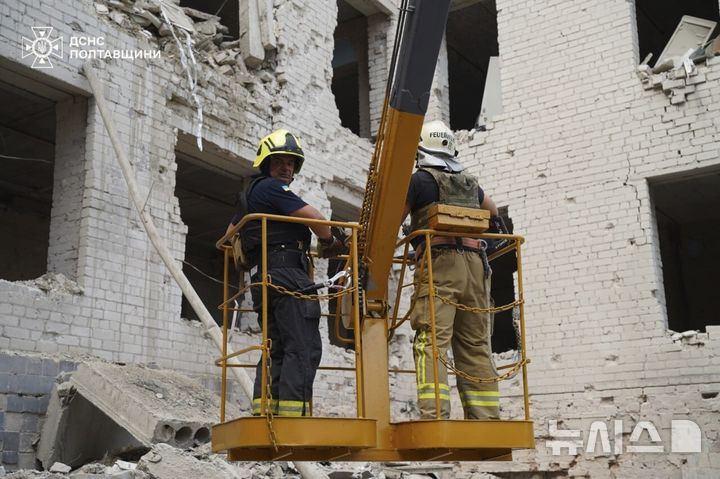 [폴타바=AP/뉴시스] 4일(현지시각) 우크라이나 동부 폴타바에서 구조대원들이 러시아의 공습으로 파손된 군사 대학 건물을 수색하고 있다. 현지 당국은 러시아군이 폴타바를 공습해 최소 47명이 숨지고 200여 명이 다쳤다고 밝혔다. 2024.09.05.