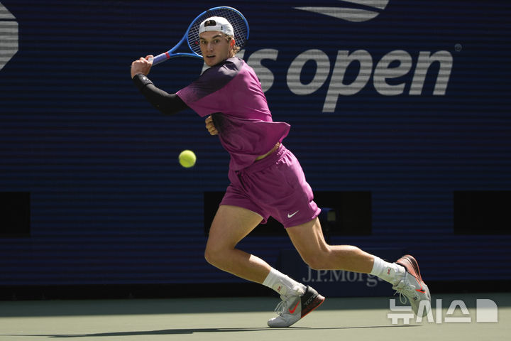 [뉴욕=AP/뉴시스] 잭 드레이퍼(25위·영국)가 4일(현지시각) 미국 뉴욕의 빌리진킹 내셔널 센터에서 열린 2024 US오픈 테니스 남자 단식 8강전에서 알렉스 드미노어(10위·호주)와 경기하고 있다. 드레이퍼는 3-0(6-3 7-5 6-2)으로 이기고 무실 세트로 준결승에 올라 얀니크 신네르(1위·이탈리아)-다닐 메드베데프(5위·러시아) 승자와 결승 진출을 다툰다. 2024.09.05.