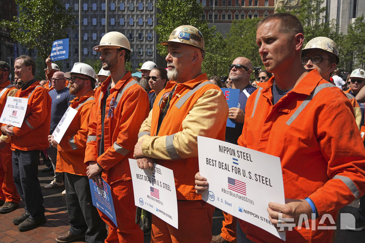 [피츠버그=AP/뉴시스] 4일(현지시각) 미 펜실베이니아주 피츠버그 유나이티드 스틸 타워 앞에서 US스틸 직원들이 일본제철의 US스틸 인수를 지지하는 집회를 열고 있다. 조 바이든 대통령은 지난 3월 "US스틸은 상징적인 미국 철강"이라며 "국내에서 소유되고 운영되는 미국 철강 회사로 남아있어야 한다"라고 말해 일본제철의 US스틸 인수 계획에 공개적으로 반대했다. 민주당 대선 후보 카멀라 해리스 부통령도 이에 반대 입장을 보인 바 있다. 2024.09.05.
