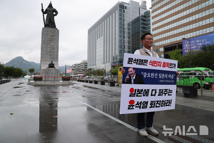 [서울=뉴시스] 배훈식 기자 = 한일역사정의평화행동 등 시민단체 회원이 5일 오후 서울 종로구 광화문광장 이순신 장군 동상 앞에서 기시다 일본 총리 방한 규탄 1인 시위를 하고 있다. 2024.09.05. [email protected]