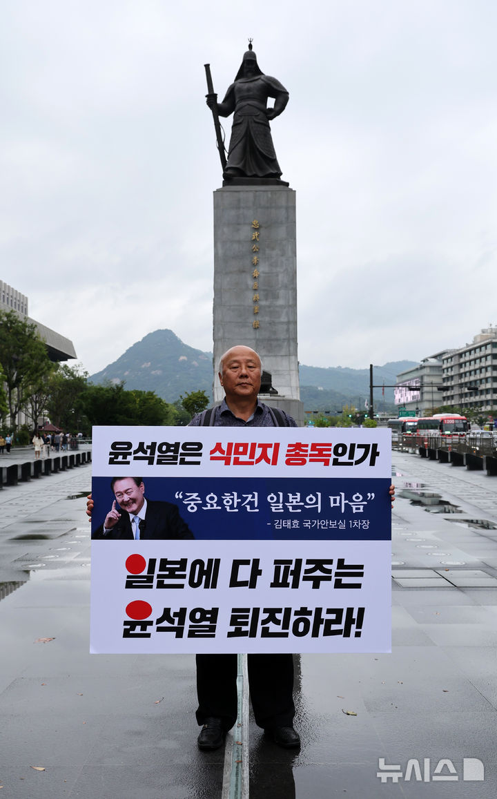 [서울=뉴시스] 배훈식 기자 = 한일역사정의평화행동 등 시민단체 회원이 5일 오후 서울 종로구 광화문광장 이순신 장군 동상 앞에서 기시다 일본 총리 방한 규탄 1인 시위를 하고 있다. 2024.09.05. [email protected]