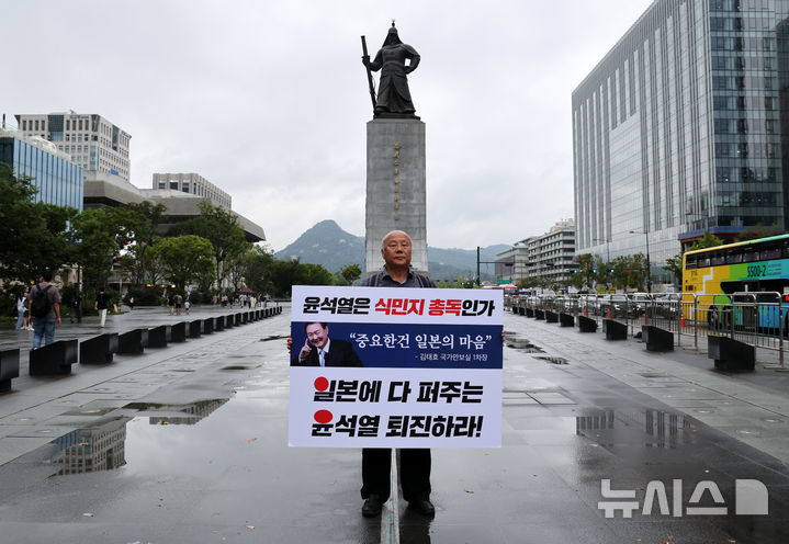 [서울=뉴시스] 배훈식 기자 = 한일역사정의평화행동 등 시민단체 회원이 5일 오후 서울 종로구 광화문광장 이순신 장군 동상 앞에서 기시다 일본 총리 방한 규탄 1인 시위를 하고 있다. 2024.09.05. [email protected]