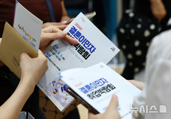 [서울=뉴시스] 전신 기자 = 5일 서울 동작구 서울가족플라자에서 열린 2024년 결혼이민자 취업박람회에서 참석자들이 안내서를 살펴보고 있다. 2024.09.05. [email protected]